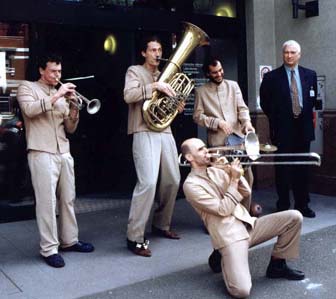 trombone, tuba, drum and vocals who play funk, blues, Latin American hits